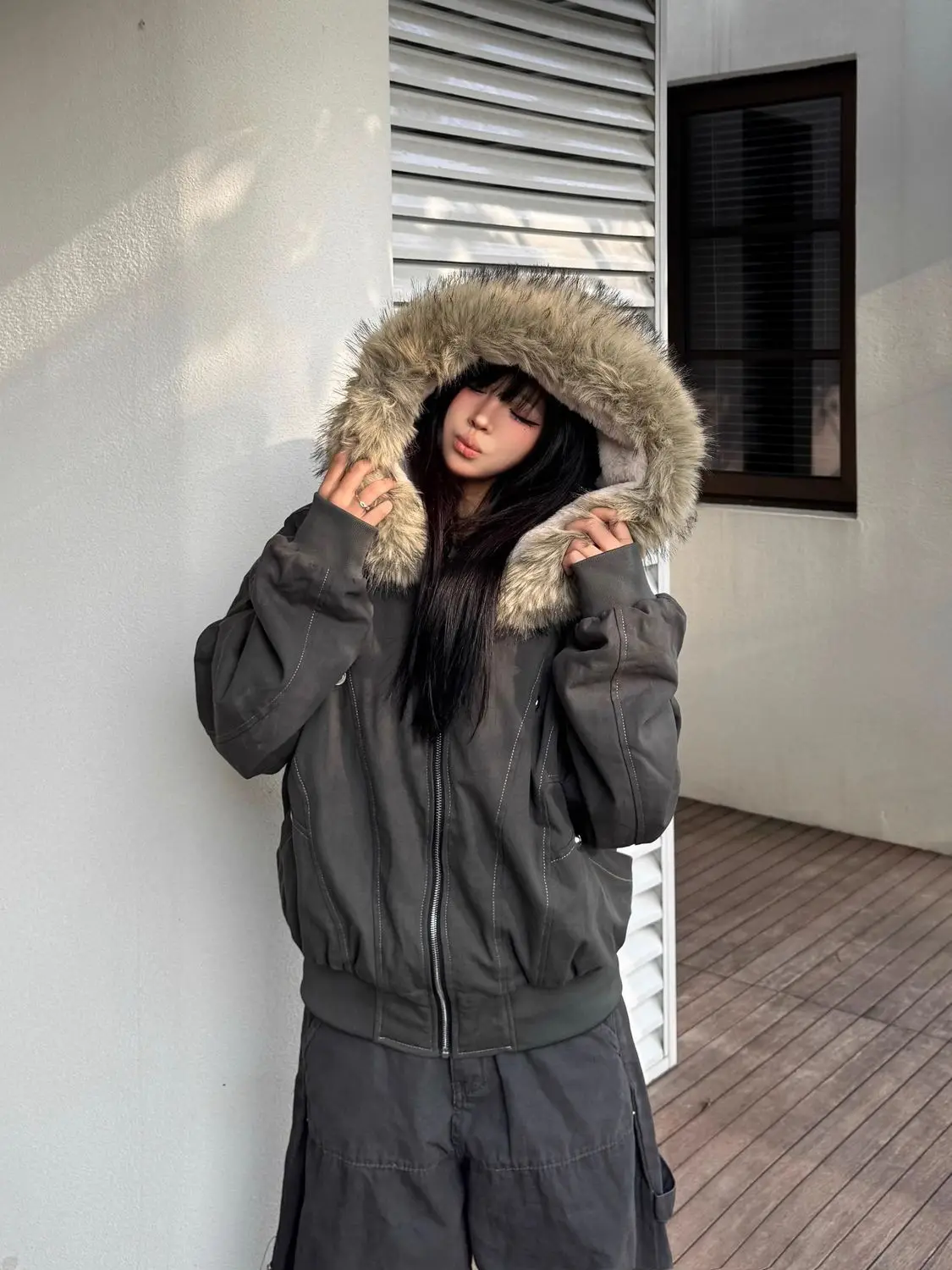 American Street Fur Collar Zipper Hooded Jacket Women Autumn Winter Retro New Velvet Thicken Warm Loose Casual Padded Jackets S