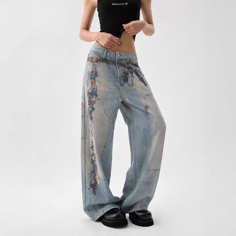 Women's American-style Retro 3D Printed Washed Wide-leg Pants